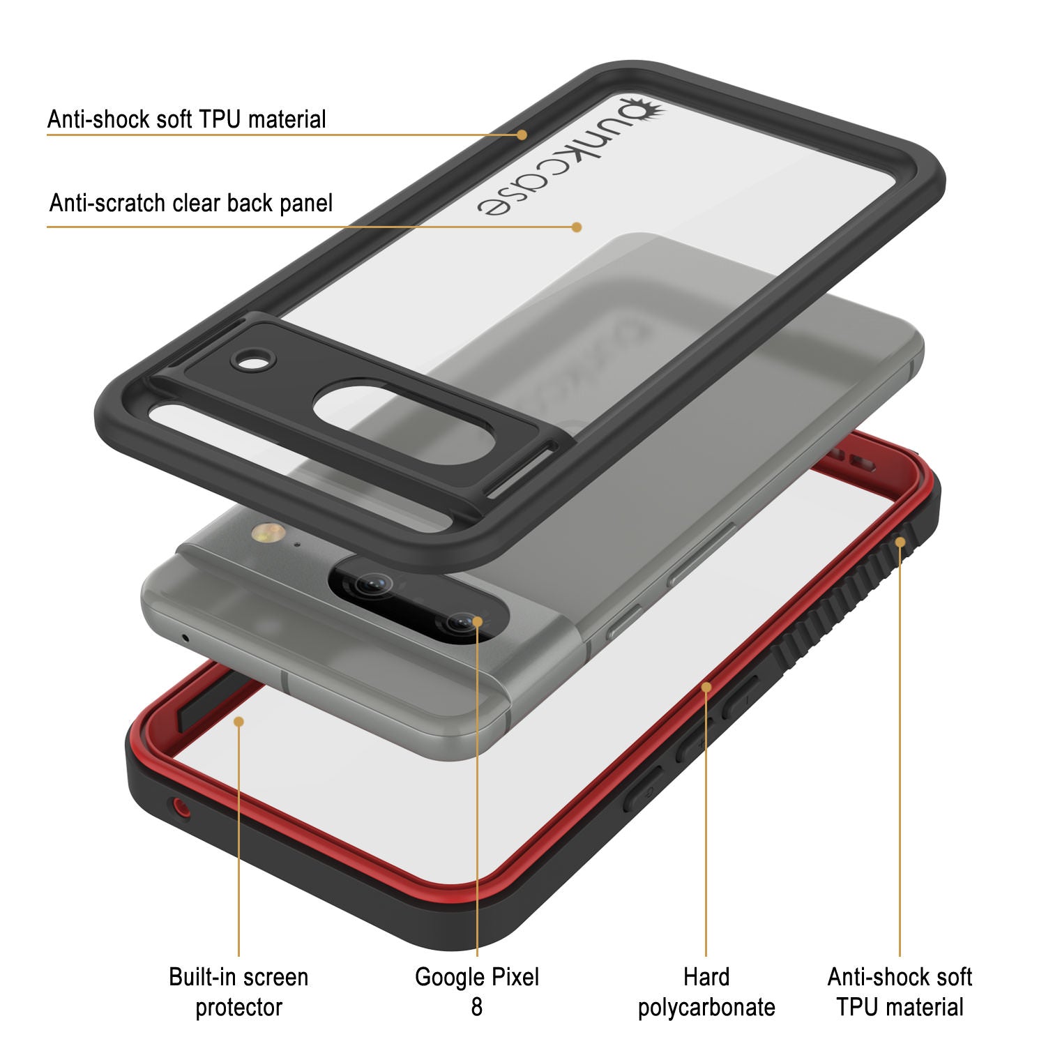 Coque étanche Punkcase Google Pixel 8 [Série Extrême] [Slim Fit] [Certifié IP68] [Antichoc] [Étanche à la neige poussière] Coque de protection avec protecteur d'écran intégré pour Google Pixel 8 (6,17 ") (2023) [Rouge]