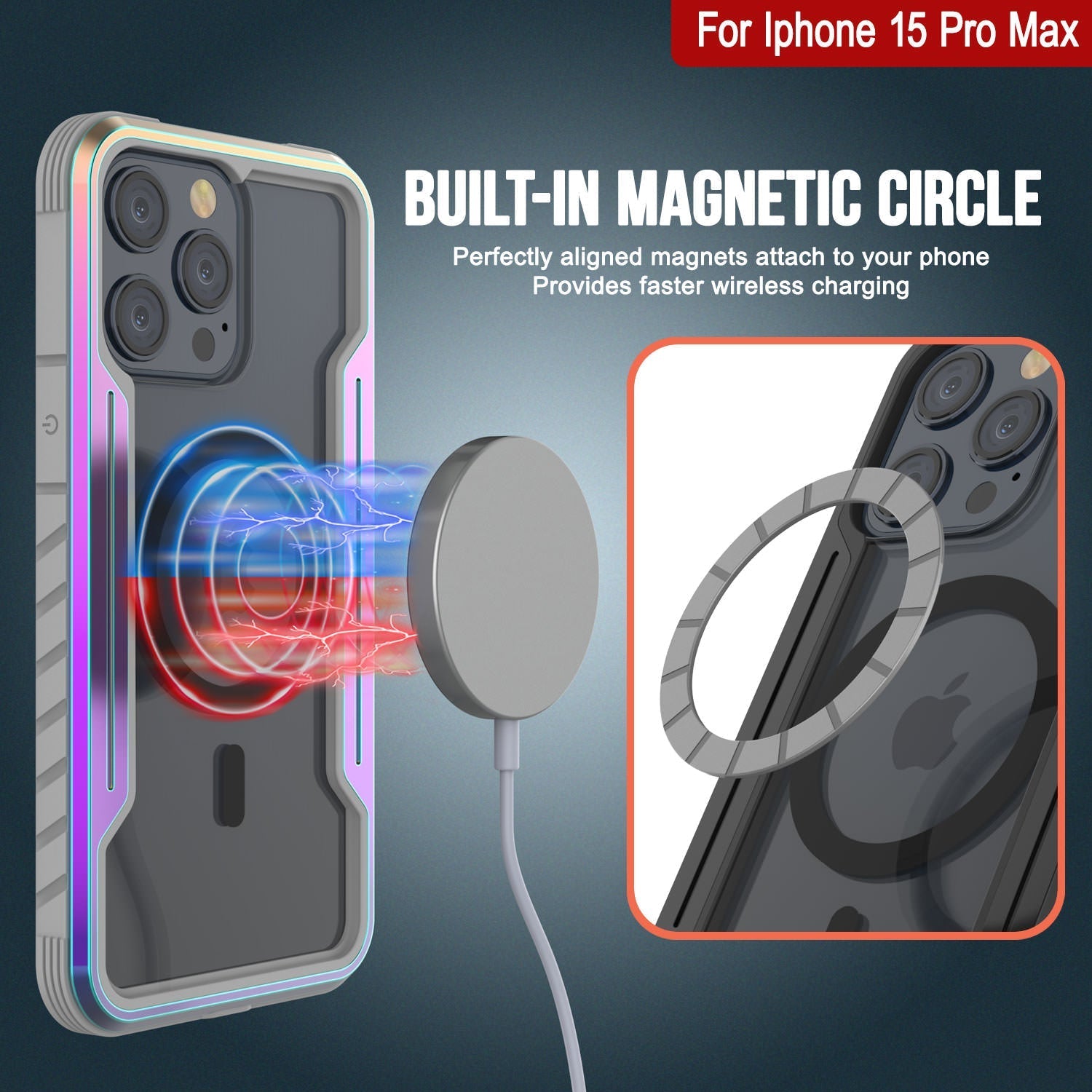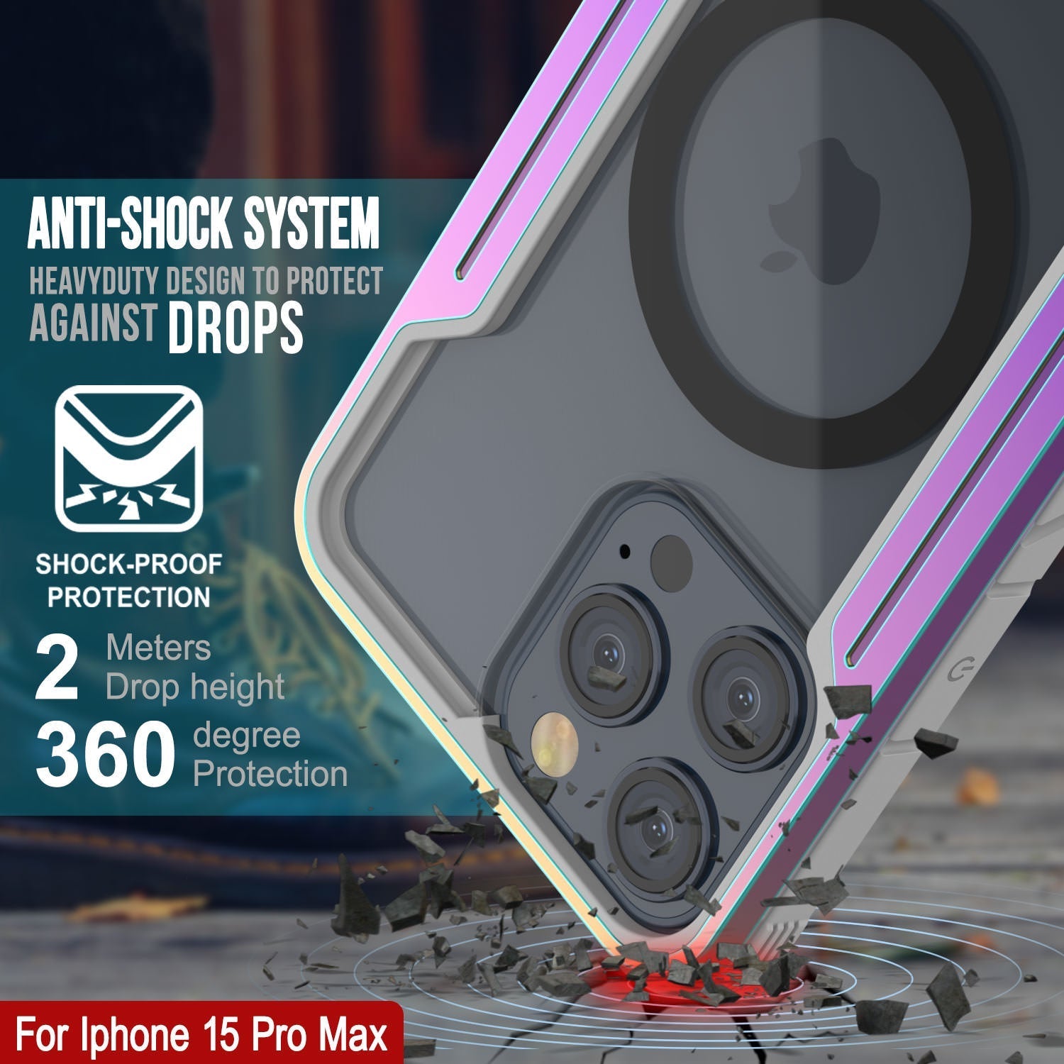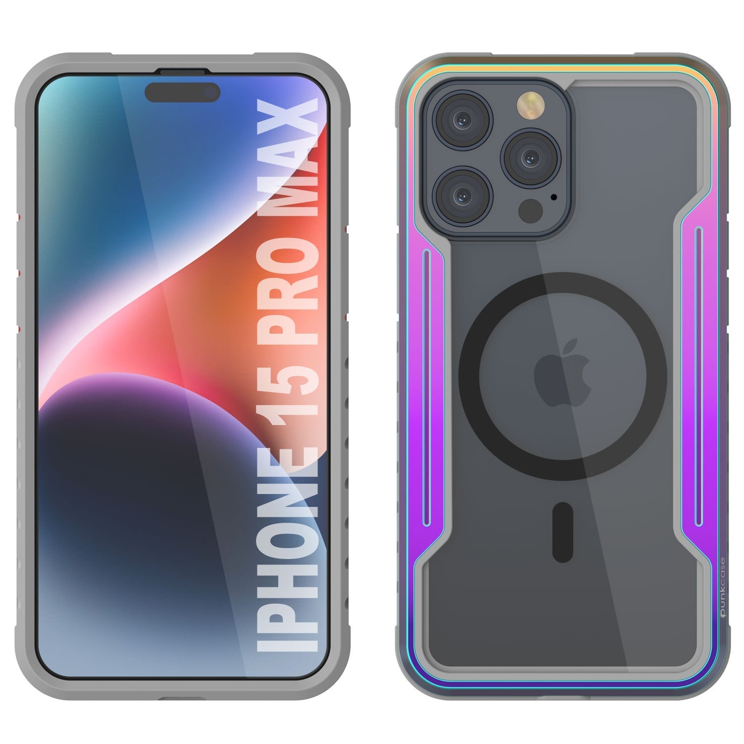 Punkcase iPhone 15 Pro Max [Série de défense Armor Stealth MAG] Coque ultra fine et protectrice de qualité militaire à plusieurs couches avec cadre en aluminium [Dos Transparent] Protection ultime contre les chutes pour votre iPhone 15 Pro Max (6.7") (2023) (Arc-en-ciel)