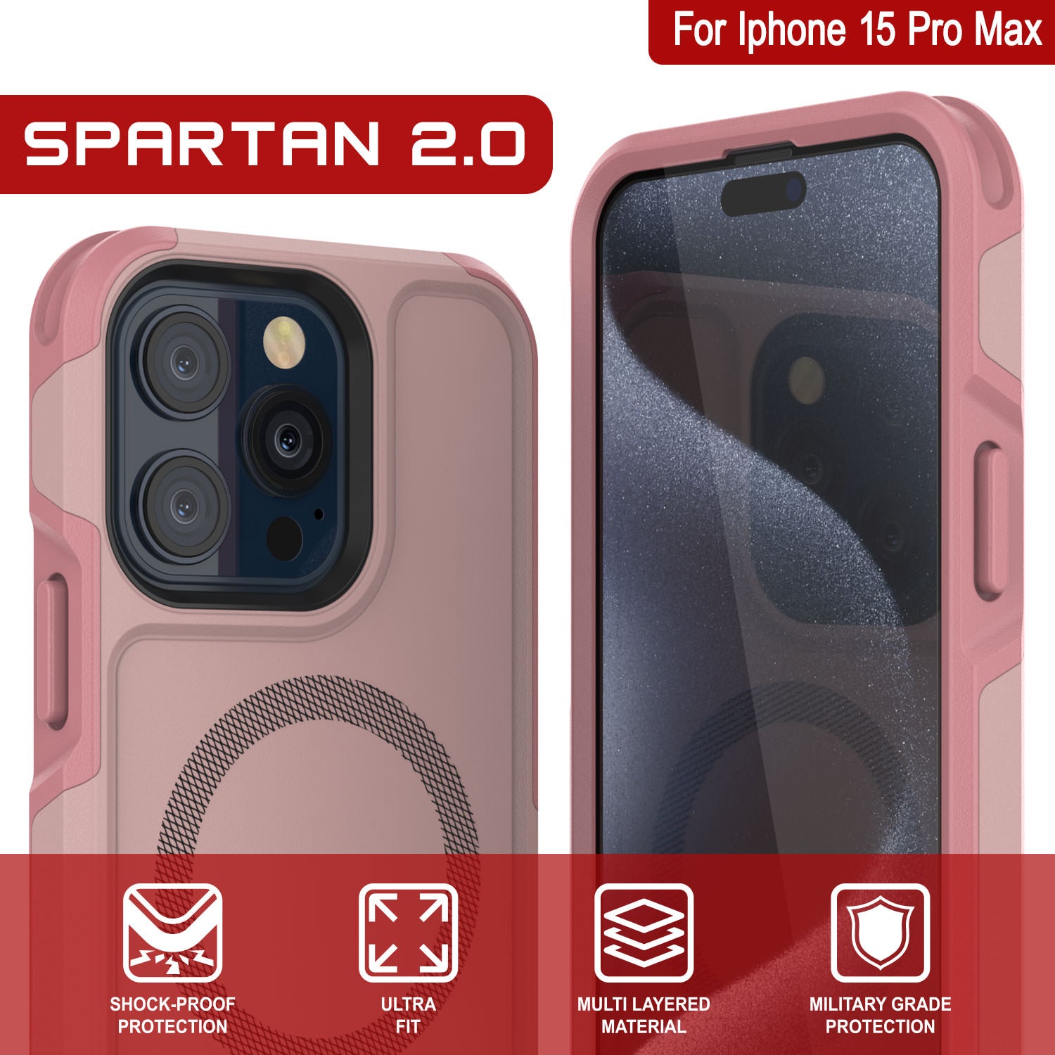 Coque PunkCase pour iPhone 15 Pro Max, Série Spartan 2.0, transparente, robuste et résistance avec protection d'écran intégrée [rose]