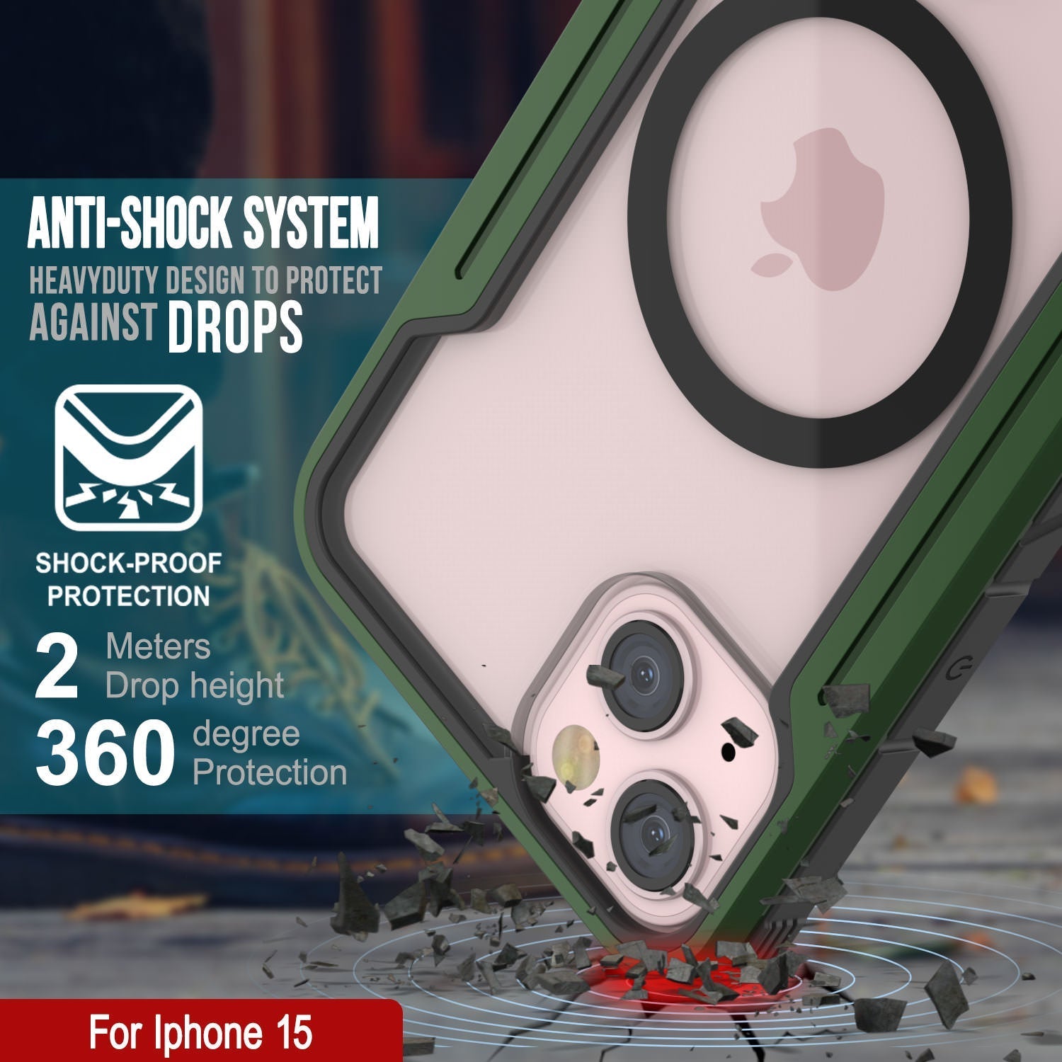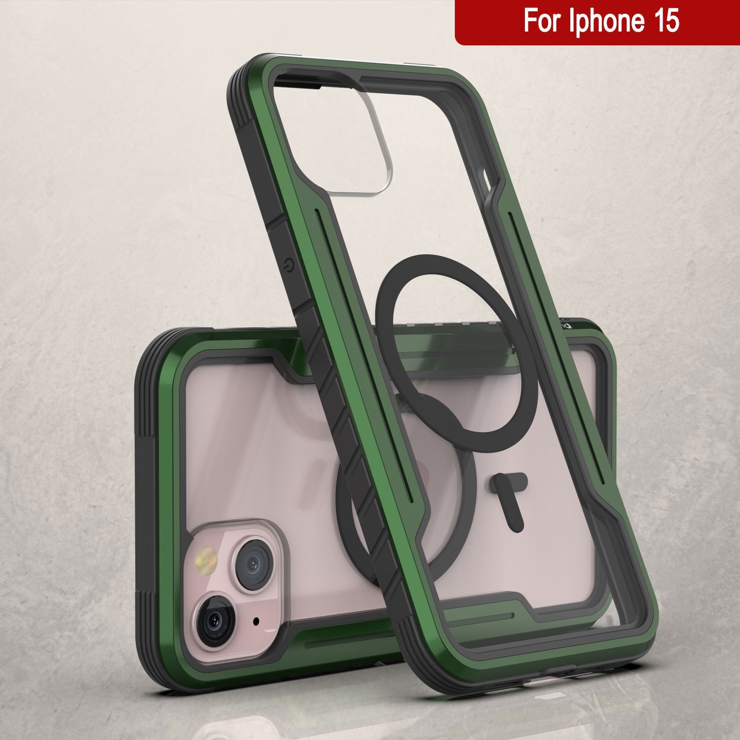 Punkcase iPhone 15 [Armor Stealth MAG Defense Series] Coque multicouche ultra fine et protectrice de qualité militaire avec cadre en aluminium [arrière transparent] Protection ultime contre les chutes pour votre iPhone 15 (6,1") (2023) (Vert foncé)