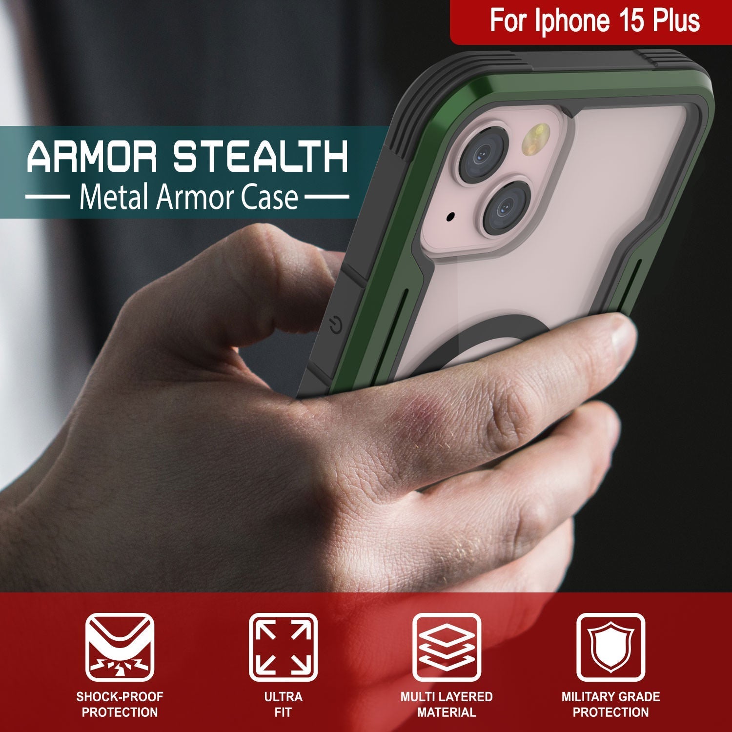 Punkcase iPhone 15 Plus [Série de défense Armor Stealth MAG] Coque ultra mince et protectrice de qualité militaire à couches multiples avec cadre en aluminium [Dos transparent] Protection ultime contre les chutes pour votre iPhone 15 Plus (6,7") (2023) (Vert foncé)